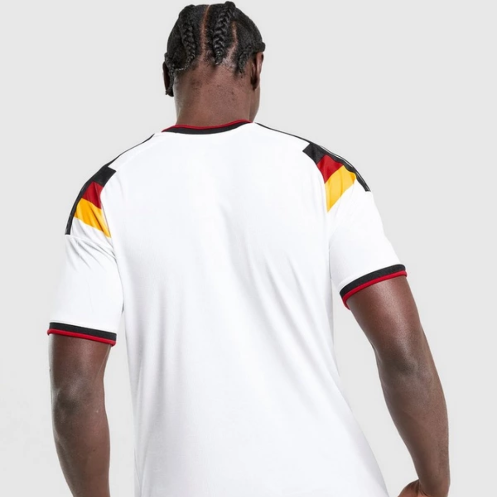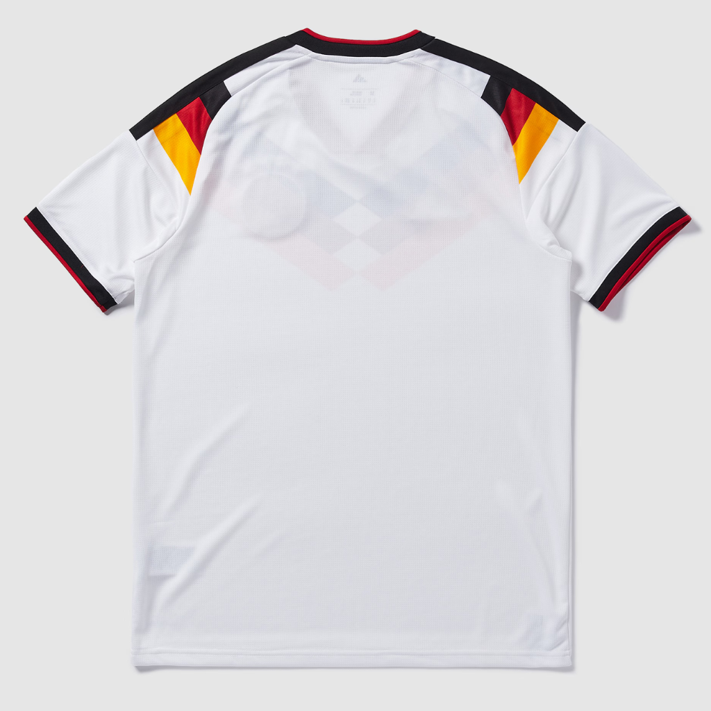 • Inscrição na parte de trás da gola: “Seit 1954 Partner der Deutschen Nationalmannschaft” (Desde 1954, parceiro da Seleção Alemã) em homenagem ao último uniforme da adidas para a Alemanha