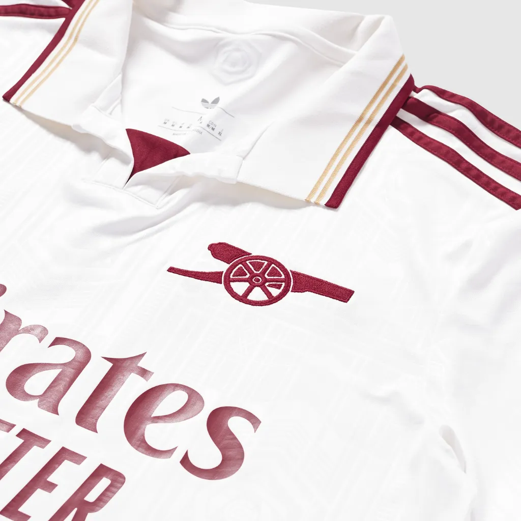 A base em branco-creme cria uma atmosfera elegante e atemporal. Essa escolha remete aos uniformes clássicos do Arsenal e transmite uma sensação de requinte minimalista. Ao mesmo tempo, detalhes em bordô profundo aparecem nas Três Listras e na gola, adicionando contraste nobre e reforçando o DNA tradicional do norte de Londres.