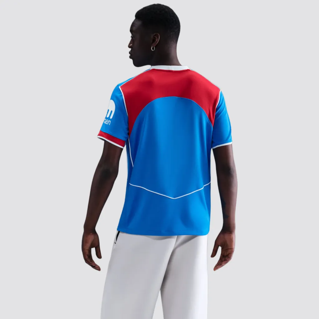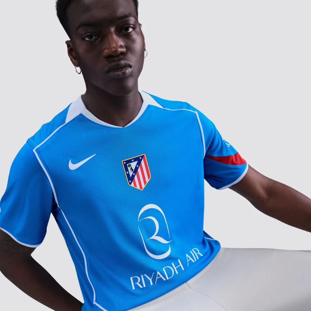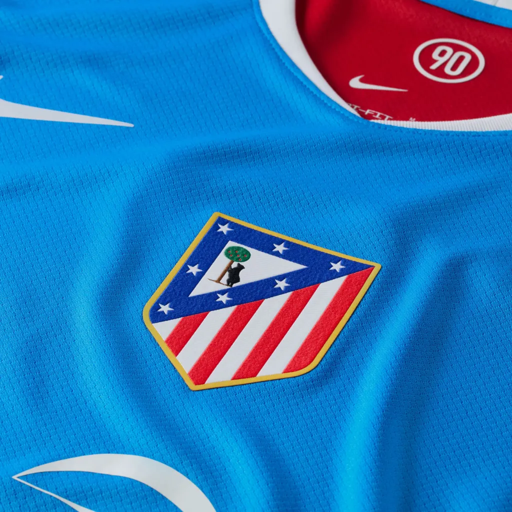 A camisa terceira do Atlético de Madrid 2025 2026 revive a estética Total 90 com base azul vibrante e detalhes em vermelho e branco. Com escudo centralizado, tecnologia Dri-FIT ADV e construção leve, o modelo une nostalgia, performance e identidade colchonera.