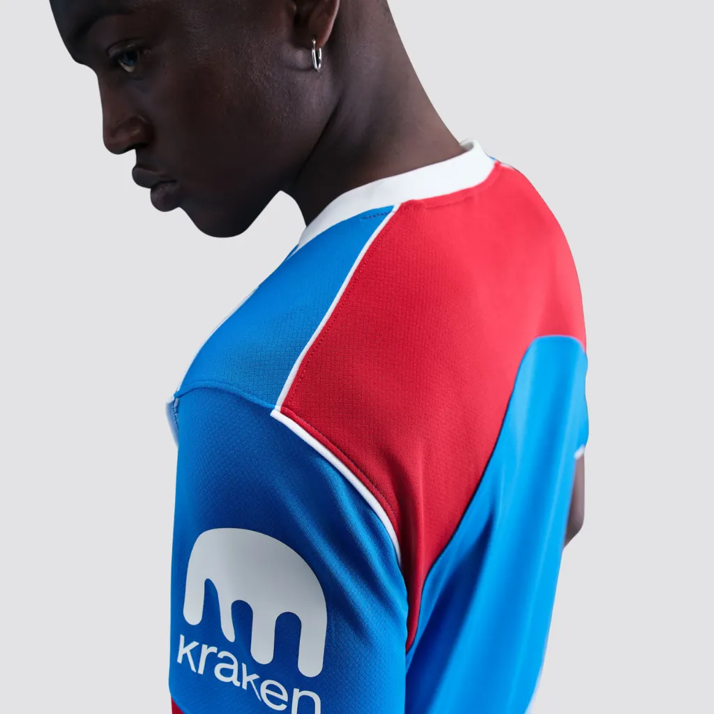 O modelo ganha vida com uma base azul vibrante, cor que domina o visual e cria um forte impacto à primeira vista. Ao mesmo tempo, detalhes em vermelho e branco contornam a camisa, reforçando a identidade histórica do Atlético de Madrid. Essa combinação cria um equilíbrio entre o futurismo do design Total 90 e a tradição colchonera.O destaque absoluto fica para o escudo do Atlético centralizado, acompanhado pelo Swoosh da Nike, uma escolha ousada que não era vista em uma camisa do clube desde a temporada 2005/06. Dessa forma, o design direciona o olhar para o centro do uniforme, valorizando o símbolo máximo do Atleti e reforçando presença visual dentro e fora de campo.