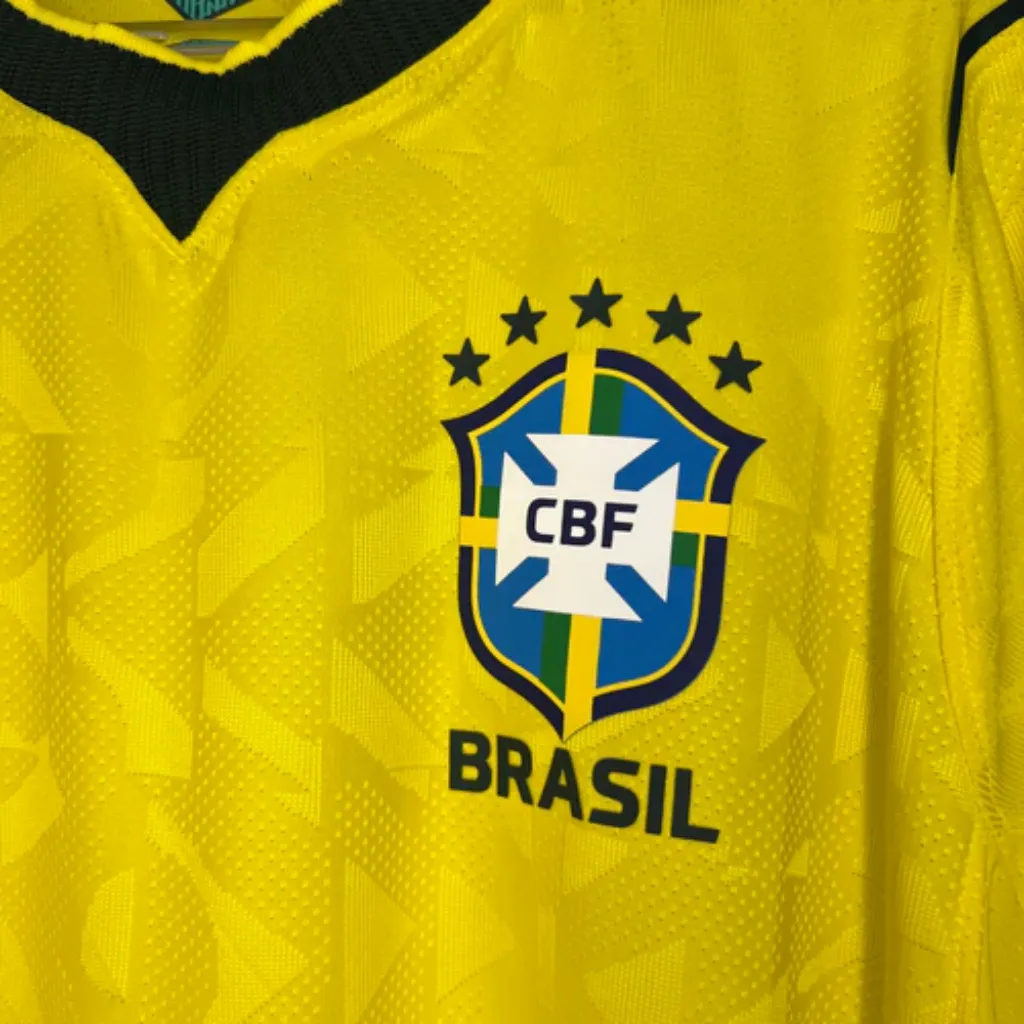 Primeiramente, o uniforme apresenta a tradicional base amarela vibrante. Essa cor se tornou símbolo da Seleção Brasileira ao longo da história.