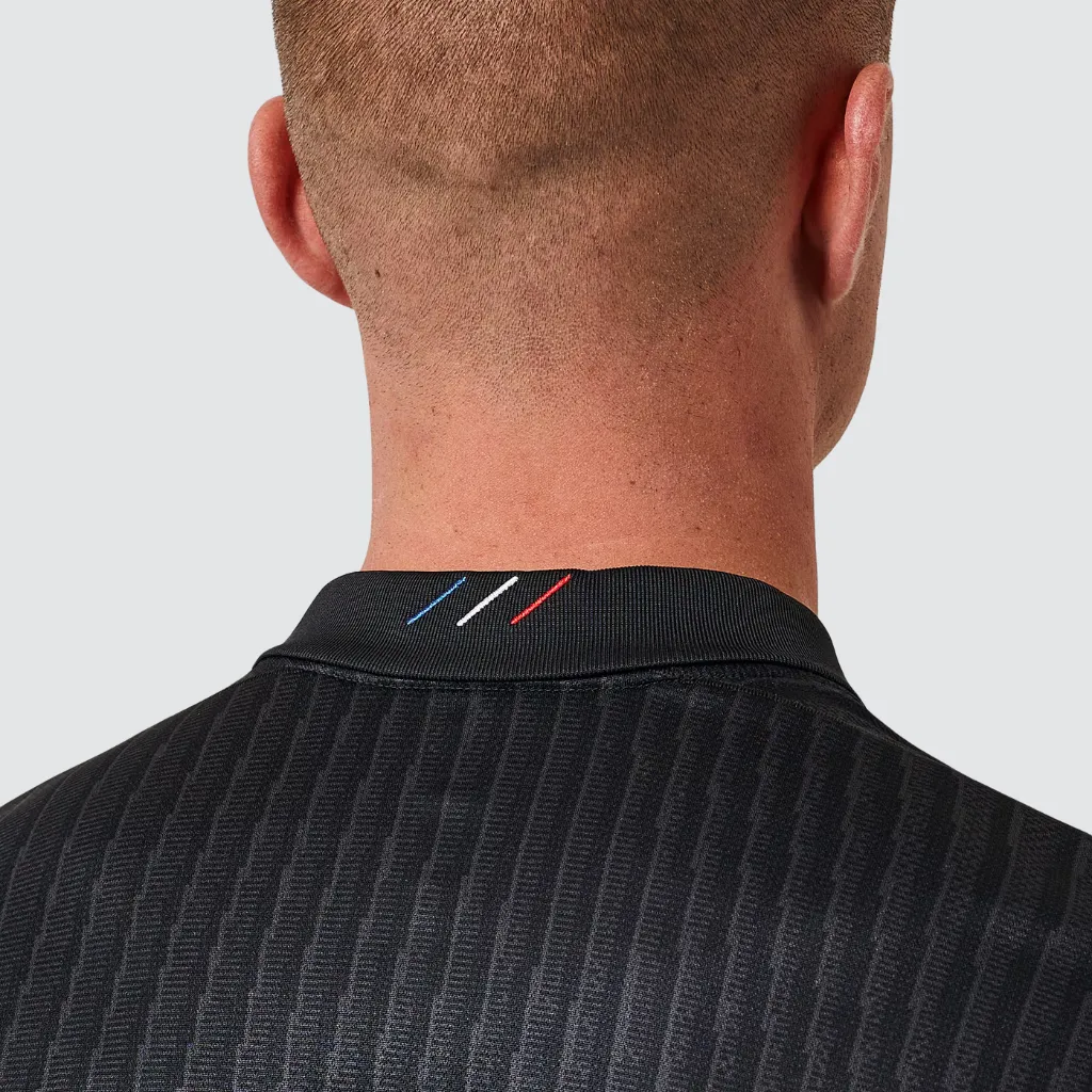 Inspirada na tradição dos ateliês de moda de Paris, a camisa apresenta uma base em tom escuro refinado, oficialmente descrito como Off Noir, combinando nuances de cinza profundo com leve fundo marrom arroxeado. Dessa forma, o visual se mantém sóbrio, elegante e altamente contemporâneo. Os detalhes em rosa pérola e prata adicionam contraste delicado, reforçando o caráter fashion da peça. Um dos grandes destaques do uniforme está no logo Jordan em rosa claro, substituindo o tradicional branco e elevando o conceito premium do design. Além disso, a camisa apresenta uma linha vertical discreta no centro, interrompida pelo patrocinador, criando uma estética limpa e alinhada ao minimalismo moderno. A versão réplica inclui uma estampa visual do Dri-FIT ADV aplicada sobre o tecido Dri-FIT tradicional, reforçando o aspecto técnico sem comprometer o visual.CONFORTO, TECNOLOGIA E USO URBANO