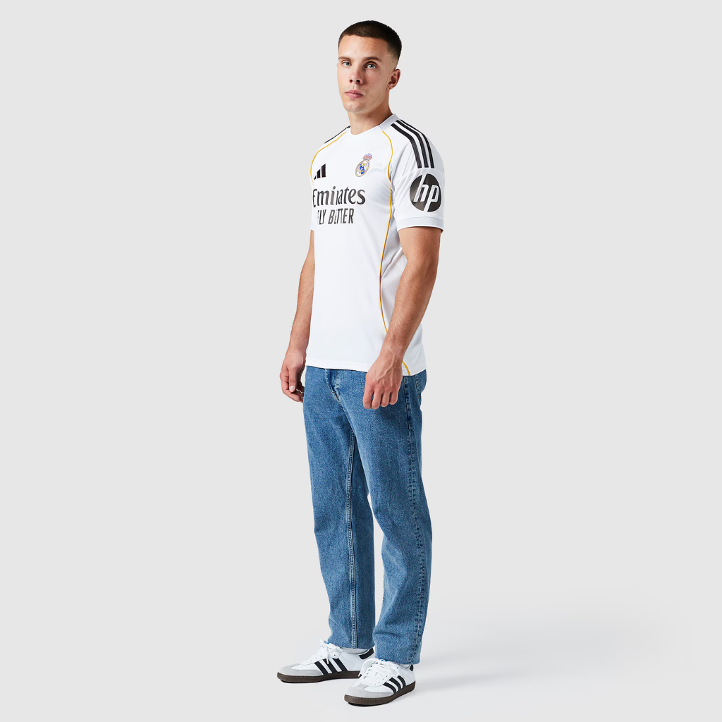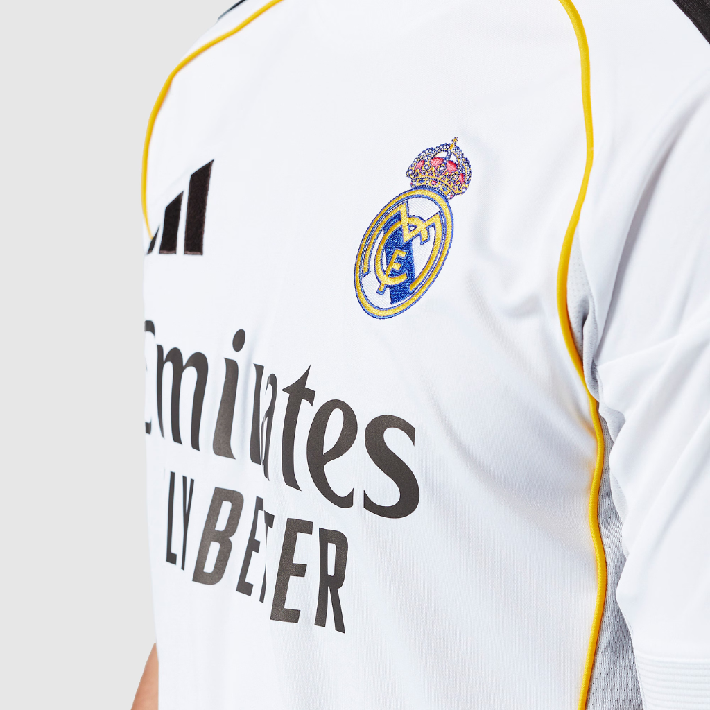 O design traz um toque retrô com detalhes em amarelo vibrante, relembrando os uniformes clássicos das décadas de 1990 e 2000 — em especial o da temporada de estreia de Cristiano Ronaldo em 2009/10. As icônicas Três Listras da adidas reforçam a herança esportiva da marca, enquanto o escudo bordado do Real Madrid no peito mostra ao mundo de que lado você está.