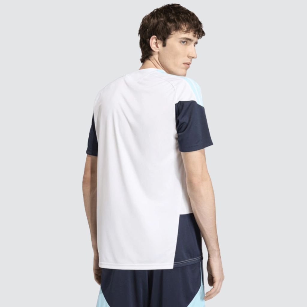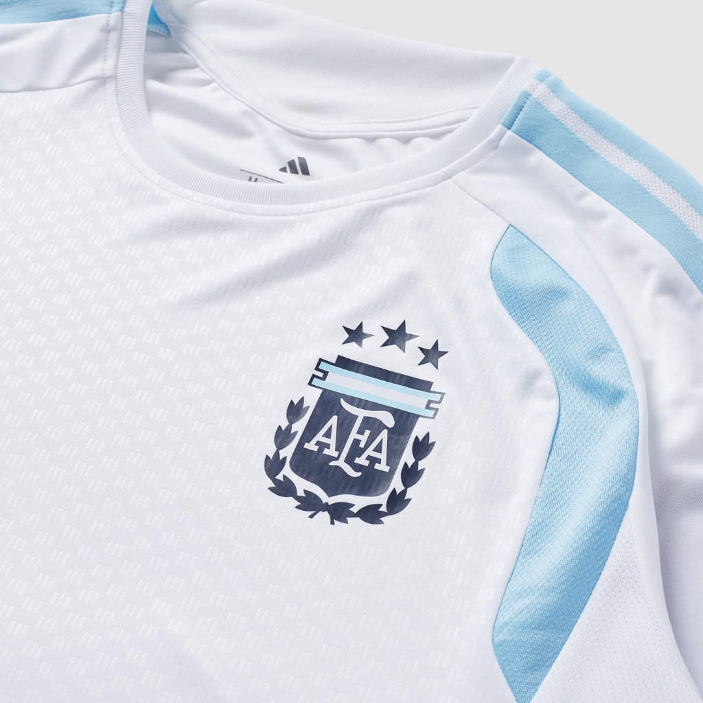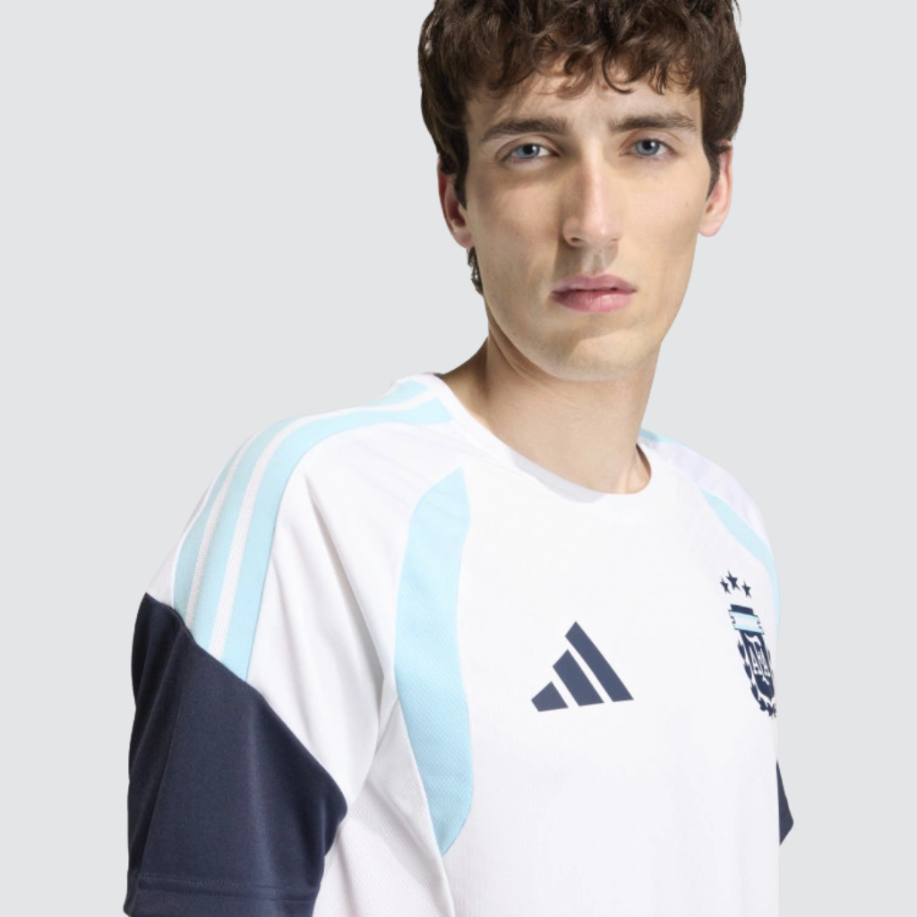 O modelo apresenta base branca com contrastes em azul-marinho e azul-claro, criando um visual moderno e equilibrado. Além disso, o escudo da AFA aparece aplicado sobre o peito, destacando o orgulho argentino. As três listras da adidas surgem nos ombros em tom escuro, enquanto os painéis laterais em mesh aumentam a ventilação durante o uso. A gola careca canelada oferece ajuste confortável, enquanto o corte slim garante visual esportivo sem limitar movimentos. O design minimalista facilita combinações com outras peças de treino, tornando a camisa versátil para academia, corrida ou atividades em campo.