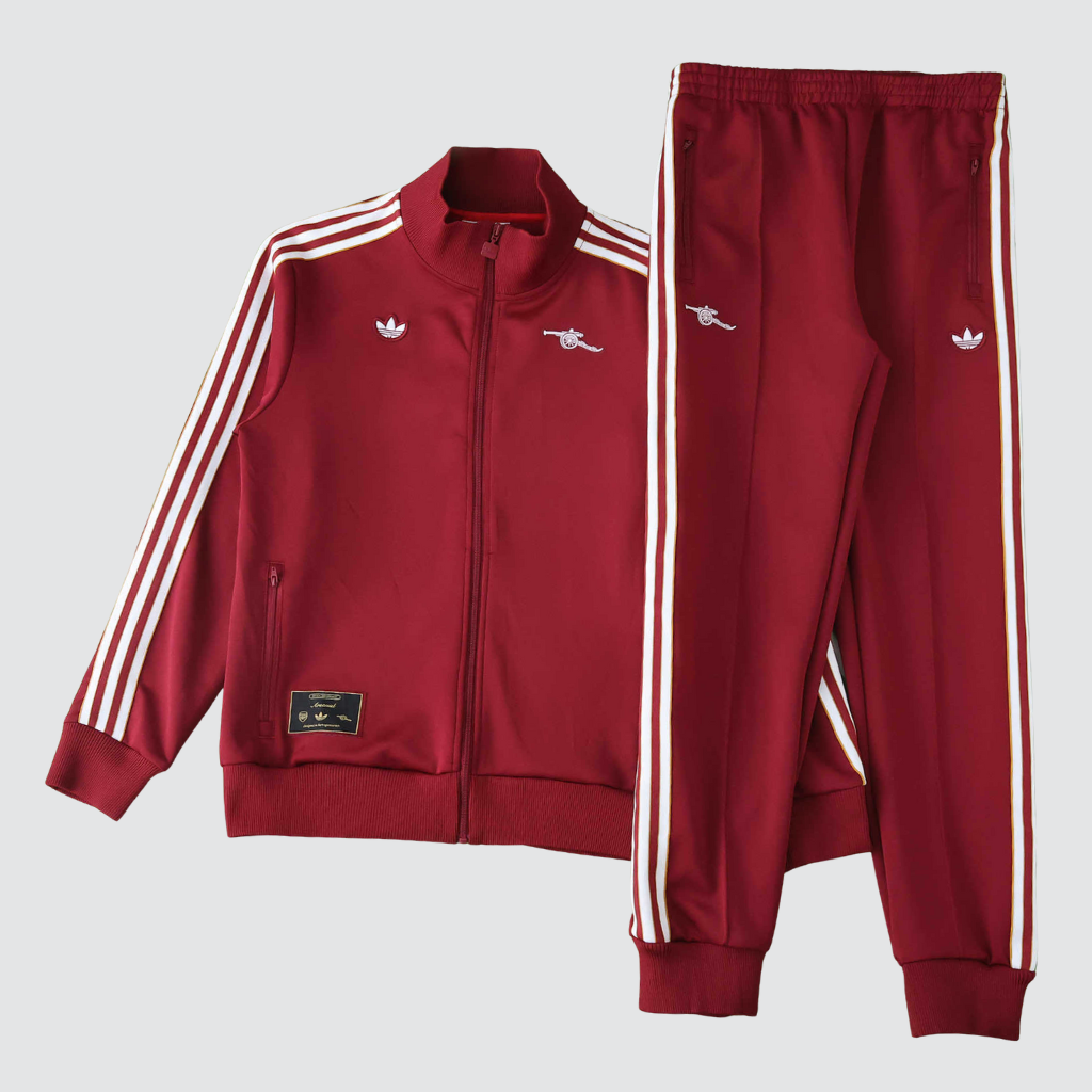 A jaqueta apresenta base em bordô profundo, com as tradicionais três listras brancas percorrendo as mangas. Além disso, o destaque fica por conta do canhão bordado, logotipo usado entre 1967 e 1978, aplicado no peito para reforçar a estética clássica. Nas costas, logo abaixo da gola, aparece o histórico emblema “A” utilizado na década de 1930, adicionando autenticidade ao design. O fechamento completo em zíper combina com a gola alta canelada, enquanto os punhos e a barra canelados garantem ajuste firme. O patch Trefoil da adidas reforça o toque retrô da linha Originals. O material leve e flexível proporciona conforto para uso diário, viagens e jogos. Além disso, os bolsos frontais com zíper oferecem praticidade para levar itens essenciais. A combinação entre nostalgia e funcionalidade faz do conjunto uma peça versátil e marcante.