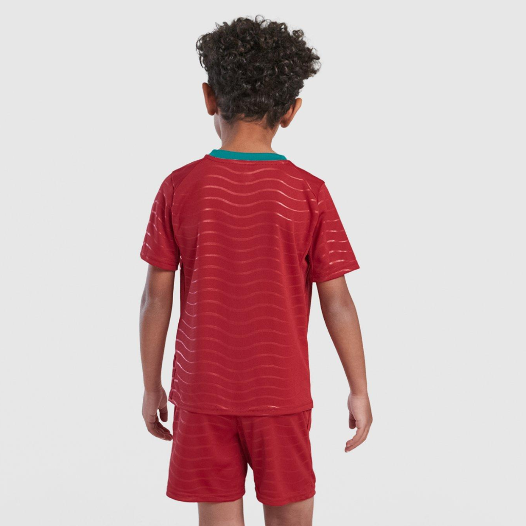 O kit infantil Portugal 2026 traz camisa vermelha com grafismos ondulados inspirados no oceano e calção vermelho combinando. Com tecnologia dryCELL, painéis em mesh e tecido reciclado, oferece conforto, leveza e identidade para os pequenos torcedores.