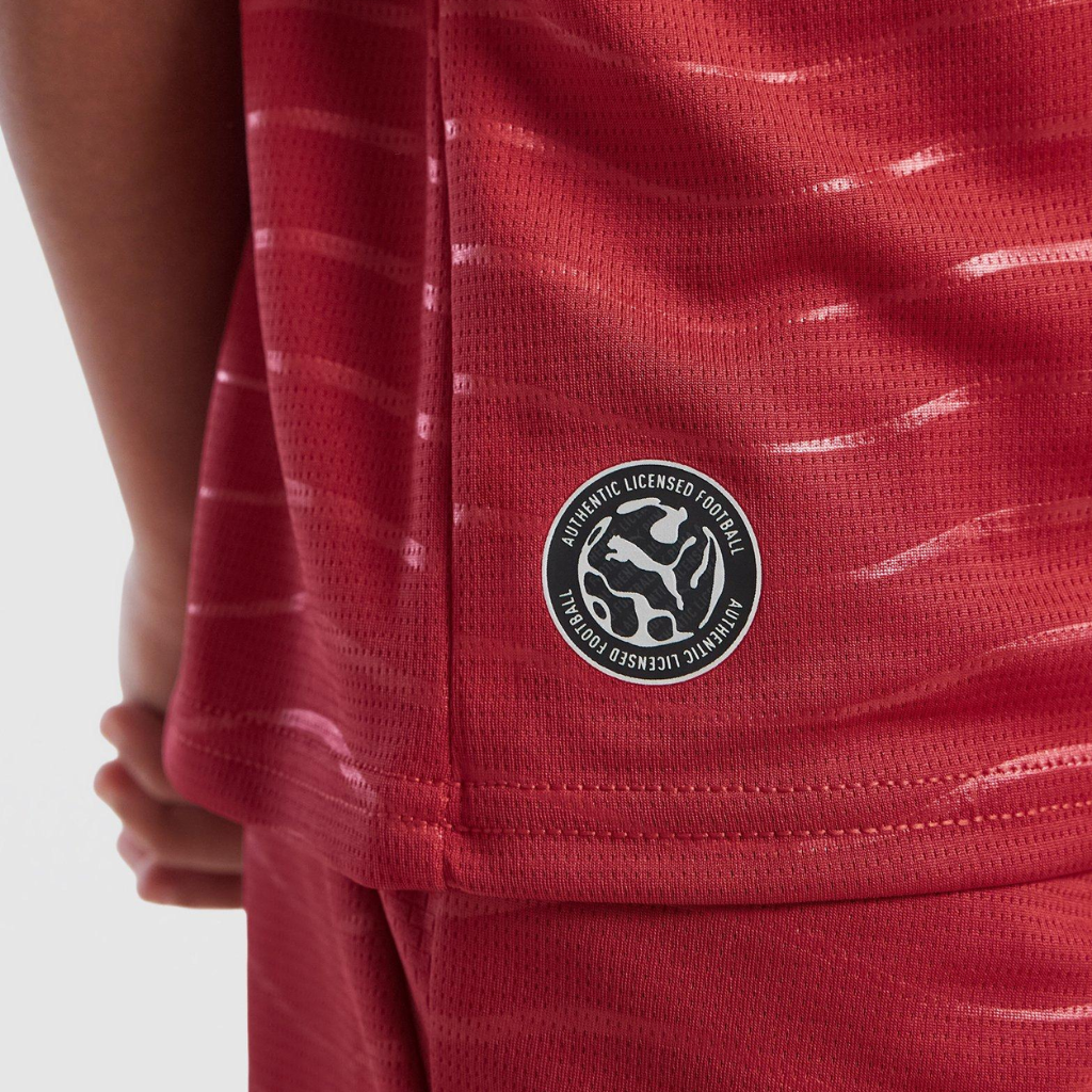 A camisa do kit apresenta base vermelha com gola V em formato especial, destacada pelo verde centralizado, repetido também nos punhos. Além disso, o corpo e as mangas recebem grafismos ondulados em tecido levemente brilhante, referência direta ao Oceano Atlântico e às grandes navegações portuguesas. O escudo da FPF aparece no peito esquerdo em sua versão atual, enquanto o felino da PUMA surge em branco nas mangas e no lado direito do peito. O conjunto é completado com calção vermelho, mantendo o padrão histórico utilizado em campanhas marcantes da seleção, como em 2016. Dentro da gola, a rosa dos ventos reforça o simbolismo marítimo e cultural. Cada detalhe foi pensado para transmitir identidade e orgulho nacional em versão mini.