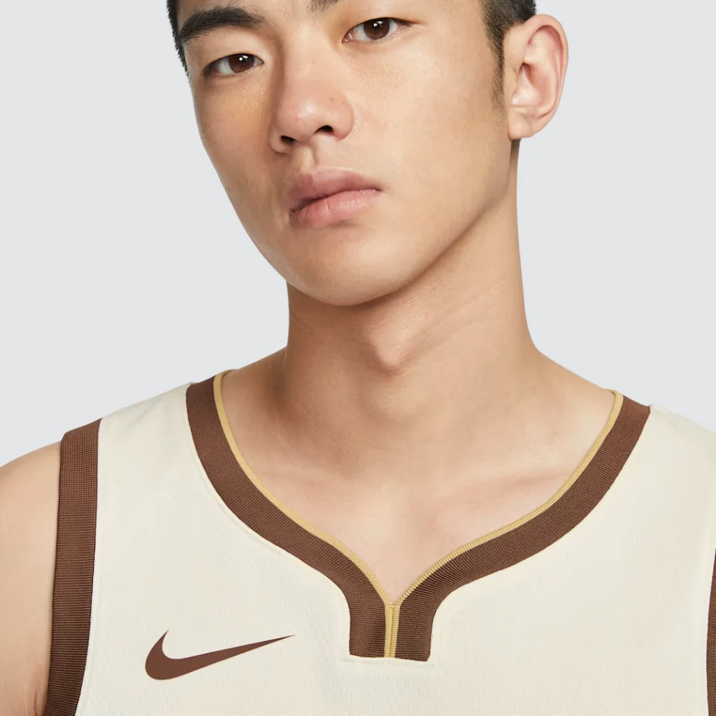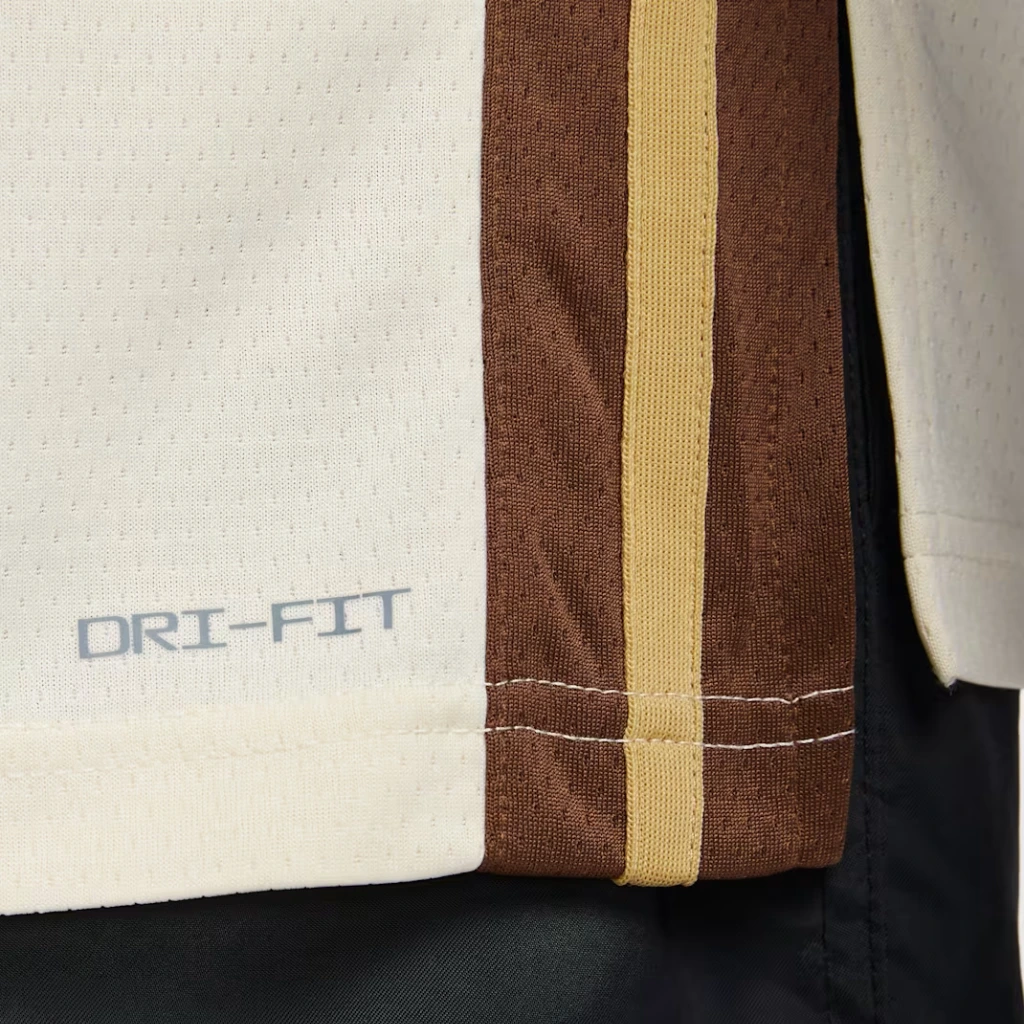 A base creme suave cria um visual elegante e poderoso, representando força e intensidade. O design tom sobre tom combina marrom escuro, creme natural e detalhes dourados, resultando em uma estética sofisticada.Ao mesmo tempo, a icônica árvore de Oakland aparece como símbolo central, reforçando raízes profundas. Os detalhes fazem referência à Ponte da Baía, presente nos elementos gráficos laterais.Essa construção visual transforma a regata Golden State Warriors City Edition 2025/26 em uma peça histórica, que honra passado e mantém relevância atual. O acabamento Swingman garante fidelidade estética e excelente caimento.