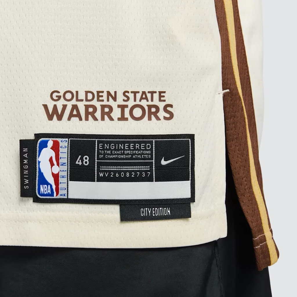 A Regata Golden State Warriors City Edition 2025/26 Swingman homenageia Oakland com design elegante, paleta sofisticada e identidade histórica marcante.